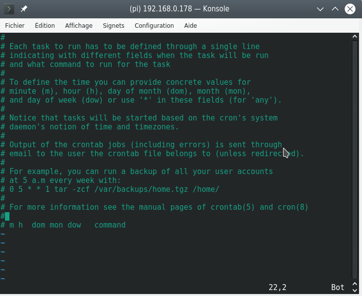 L’outil “Crontab” va nous permettre d’éditer la liste des tâches à effectuer et aussi le temps entre deux exécutions.
