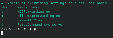 Dans notre exemple, nous autorisons les utilisateurs root et pi à accéder au ssh. Aucun autre utilisateur ne pourra alors se connecter en ssh. Il faut donc bien inclure dans les utilisateurs que vous utilisez pour votre accès ssh sous peine de vous bloquer vous même les portes.
