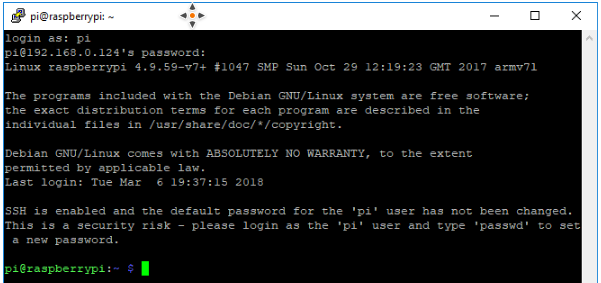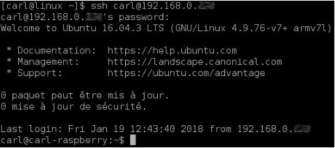 Une fenêtre terminal s’ouvre et vous demande un utilisateur existant sur Raspbian et ensuite le mot de passe.